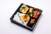 内容:天ぷら(茄子・エリンギ・海老・カニ蒲鉾)・玉子焼き・お惣菜3点種・油かれい西京焼・白米・自家製ローストビーフ・ブロッコリー・ミニトマト・パプリカ・サニーレタス・錦糸卵