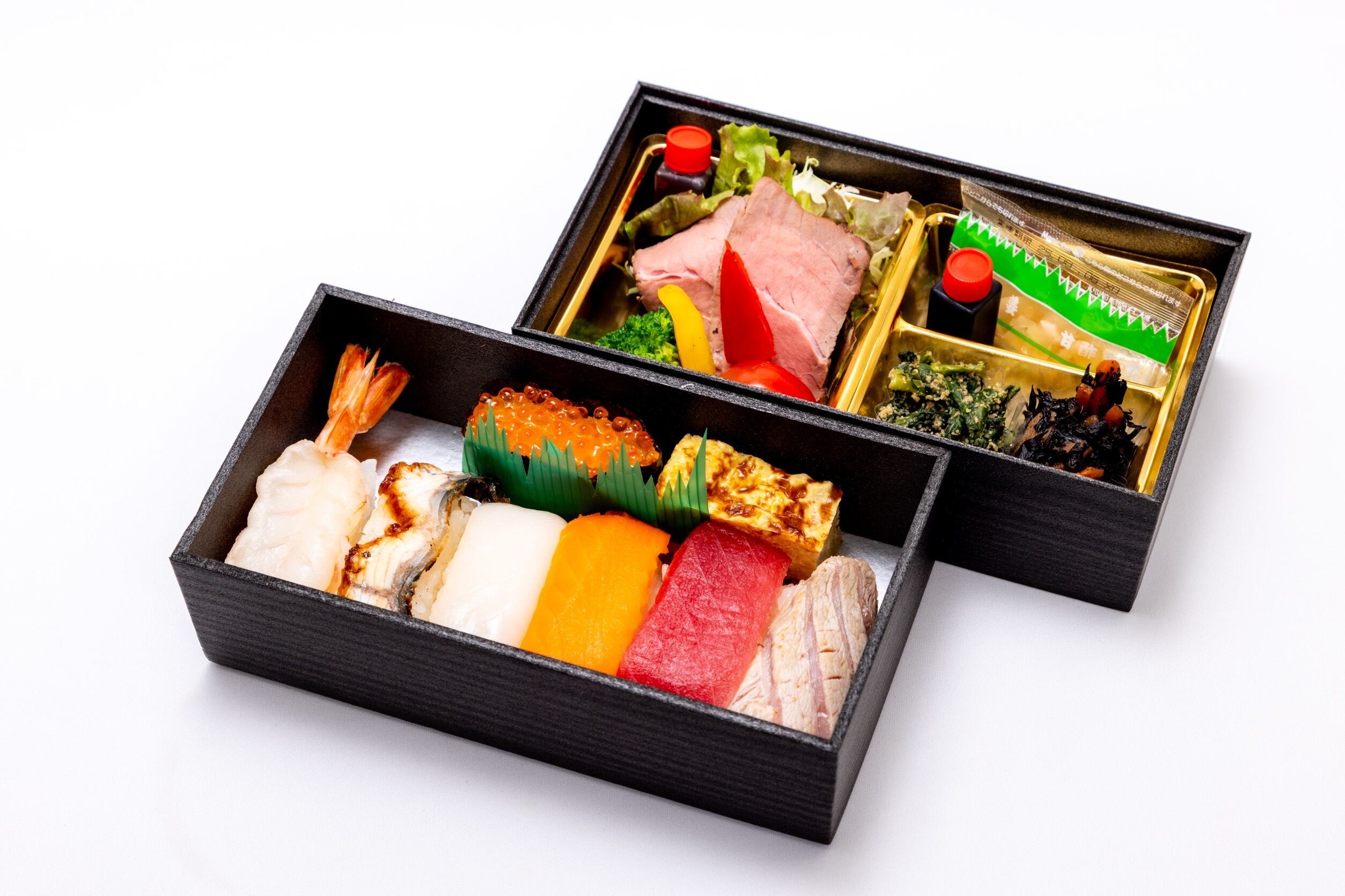 旬の魚を使った握り寿司や自家製玉子焼き、自家製ローストビーフやお惣菜も一緒になった2段弁当。