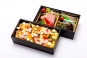 彩り良く魚介類を散らばらせたちらし寿司、季節の天ぷらやお惣菜も一緒になった人気の2段弁当。