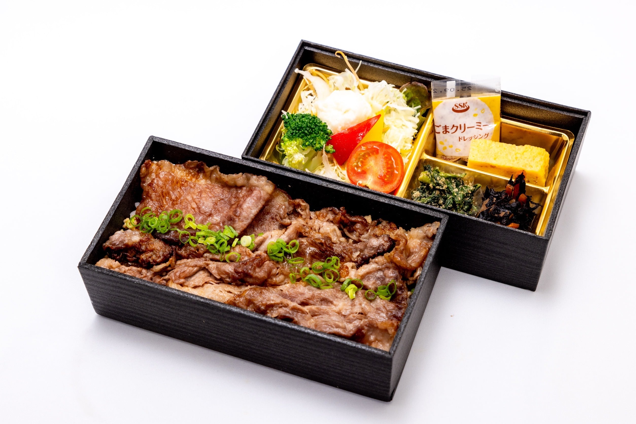 内容:国産牛・自家製玉子焼き・白米・小ねぎ・白ゴマ・サラダ(ポテトサラダ・キャベツ・ミニトマト・ブロッコリー・ゴマドレッシング・パプリカ)お惣菜2点